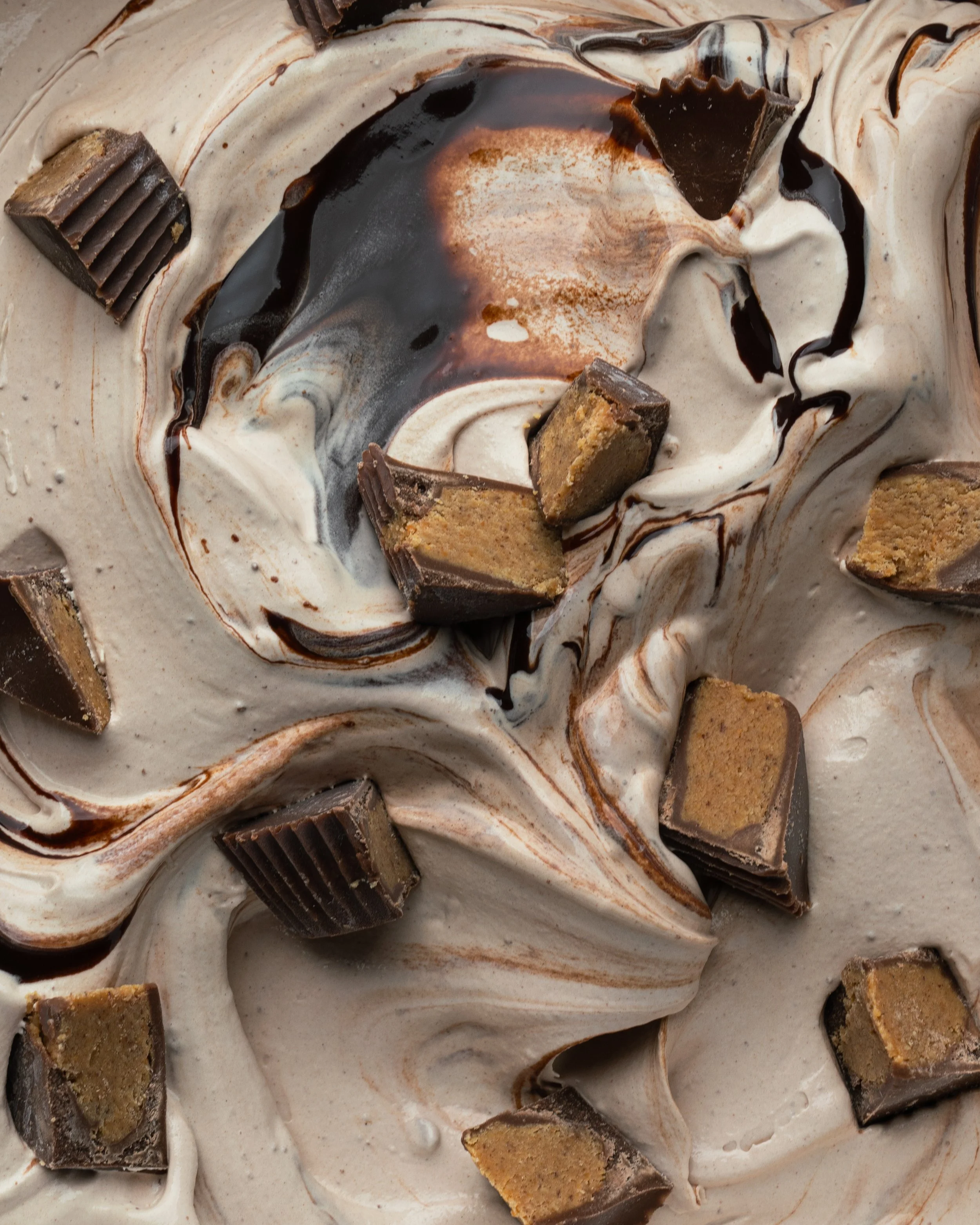 Brownie batter ice cream with chopped peanut butter cups and a chocolate swirl.